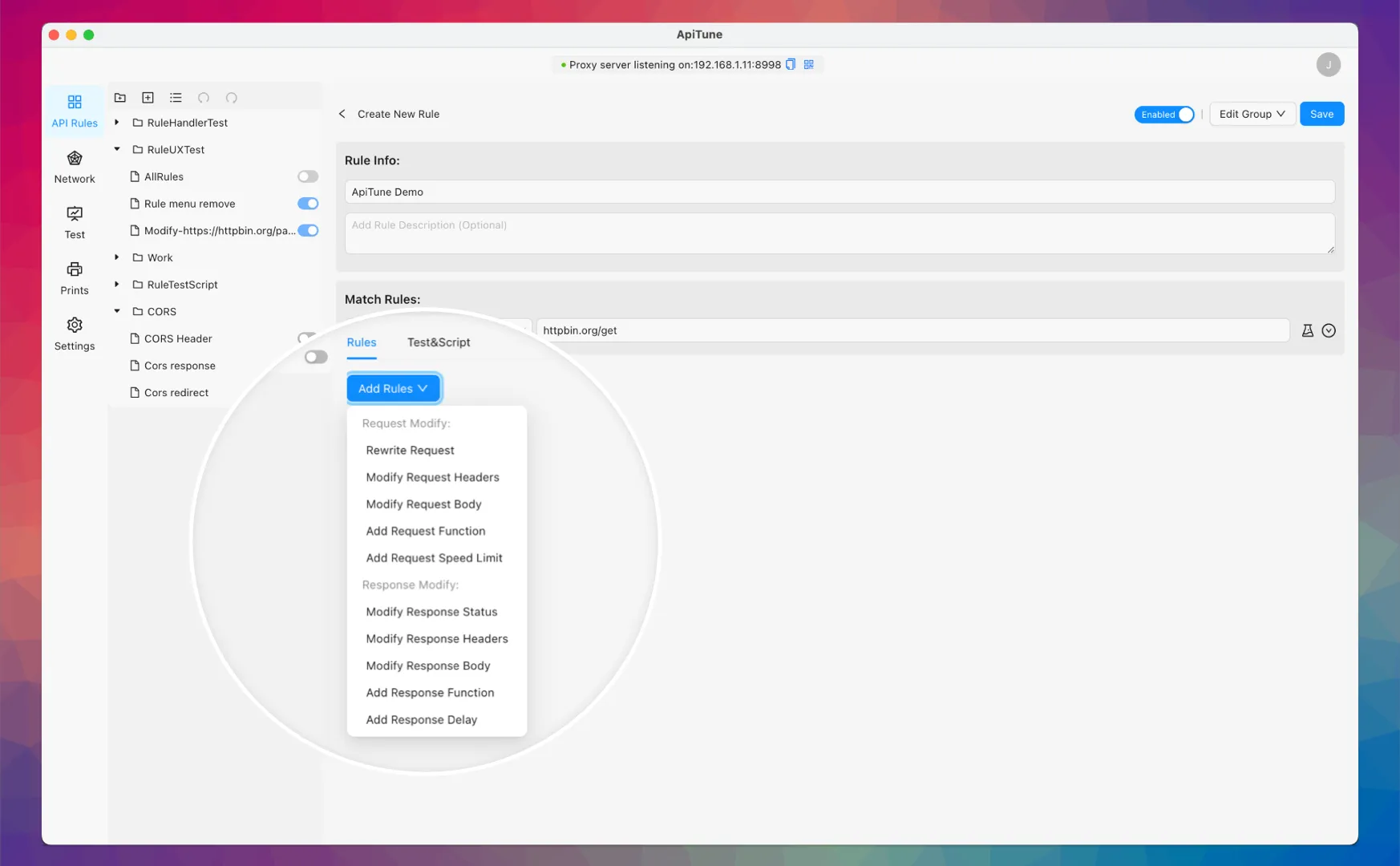 One rule to handle multiple proxy scenarios - supports URL matching, request/response modification, and various proxy modes to meet all your development needs.